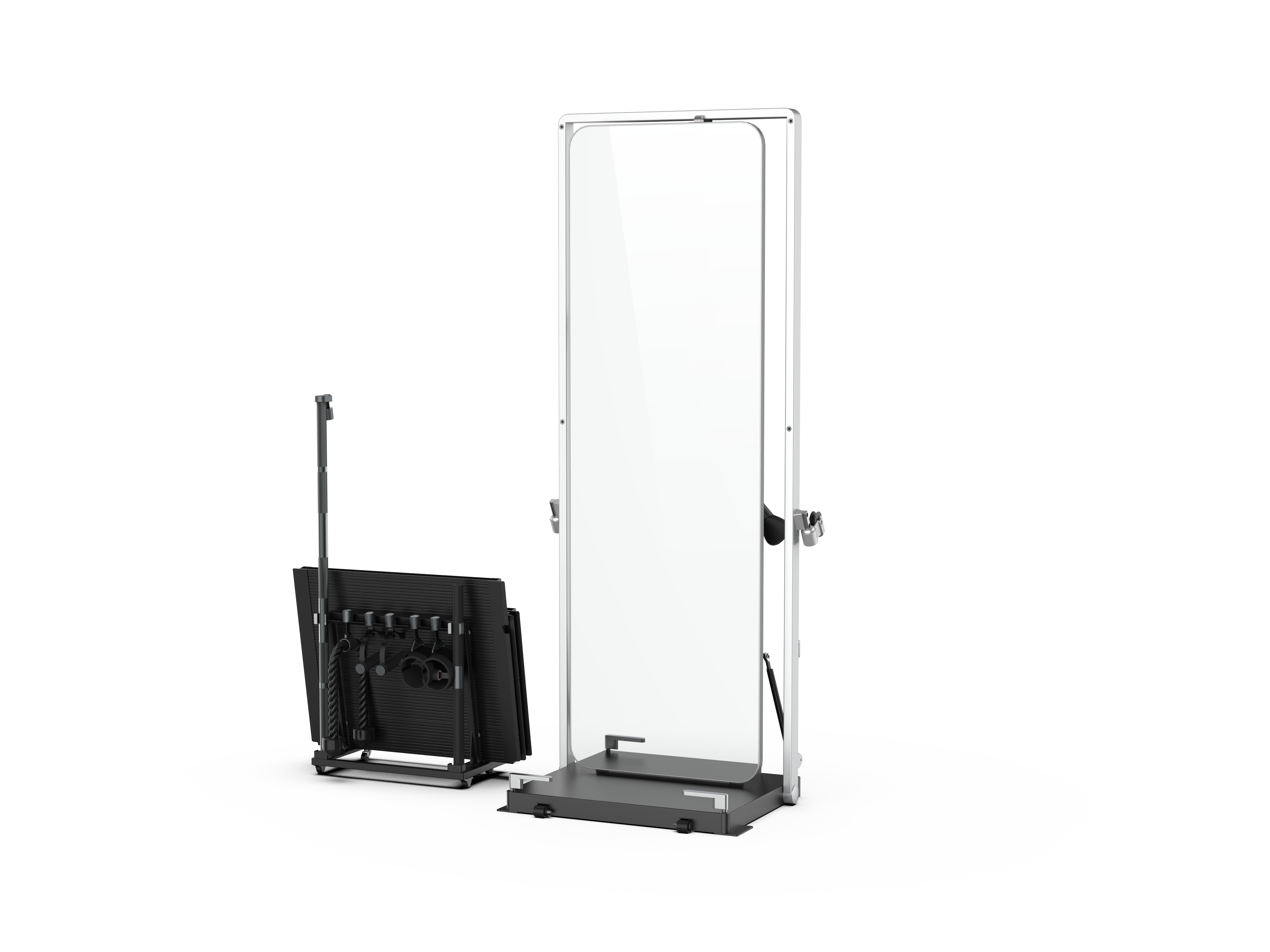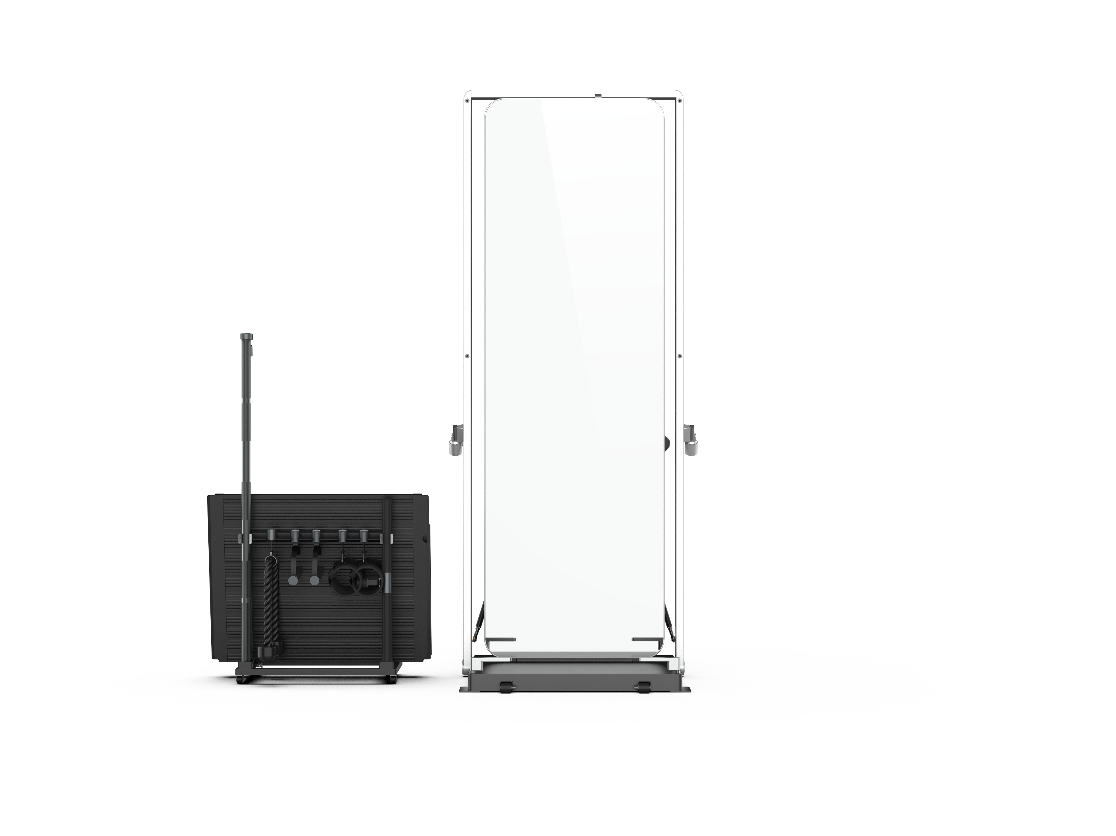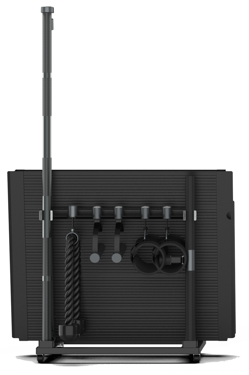 Flat Bench, Rower, Handles, Barbell, Short Bar, V-Handle, Tricep Rope, Ankle Straps, Shoulder Pad, Bluetooth Button and Hanging Holder.
